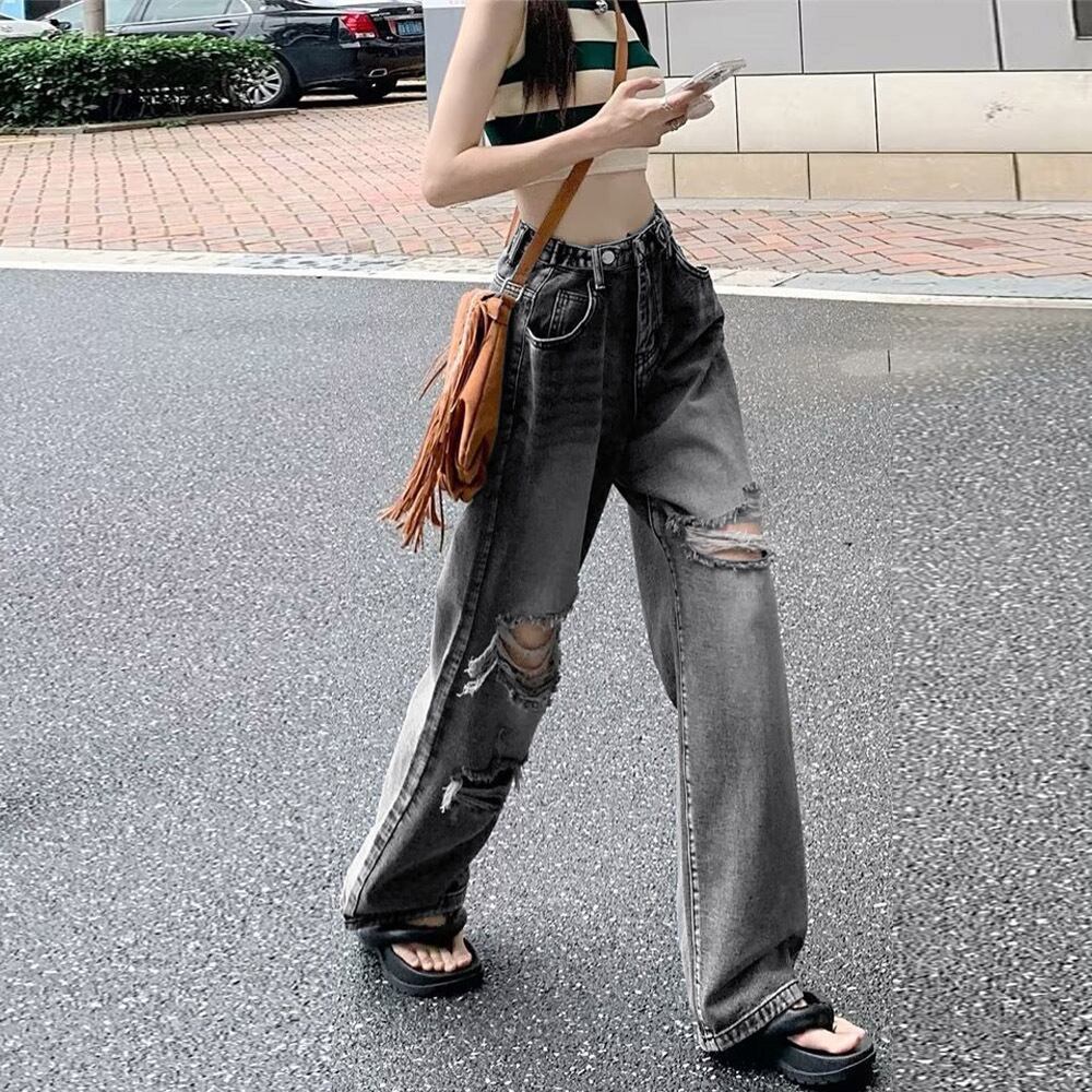 韓国ハイウエスト カジュアル ストレートジーンズ クラッシュデニムパンツ ウォッシュ加工 ストリート ジーパン おしゃれ