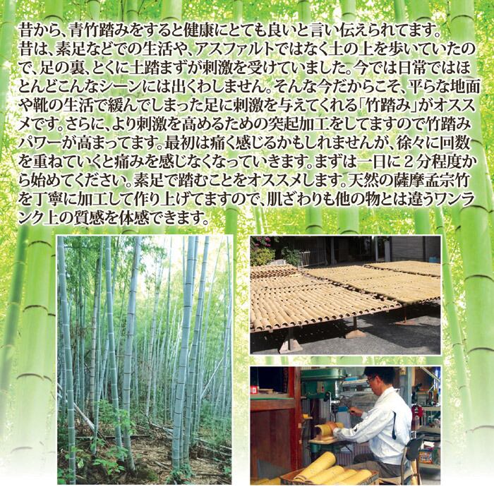 昔から、青竹踏みをすると健康にとても良いと言い伝えられてます。昔は、素足などでの生活や、アスファルトではなく土の上を歩いていたので、足の裏、とくに土踏まずが刺激を受けていました。今では日常では殆どこんなシーンには出くわしません。そんな今だからこそ、平らな地面や靴の生活で緩んでしまった足に刺激を与えてくれる「竹踏み」がオススメです。さらに、より刺激を高めるための突起加工をしてますので竹踏みパワーが高まってます。最初は痛く感じるかもしれませんが、徐々に回数を重ねていくと痛みを感じなくなっていきます。まずは一日に2分程度から始めてください。素足で踏むことをオススメします。天然の薩摩孟宗竹を丁寧に加工して作り上げてますので、肌ざわりも他の物とは違うワンランク上の質感を体感できます。